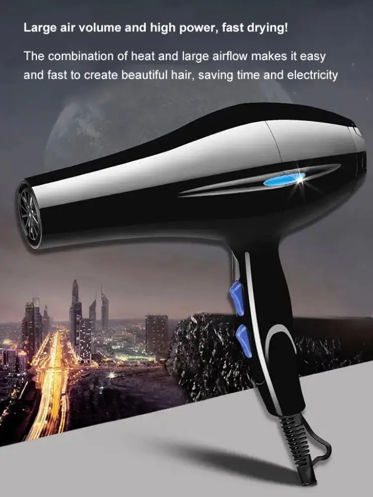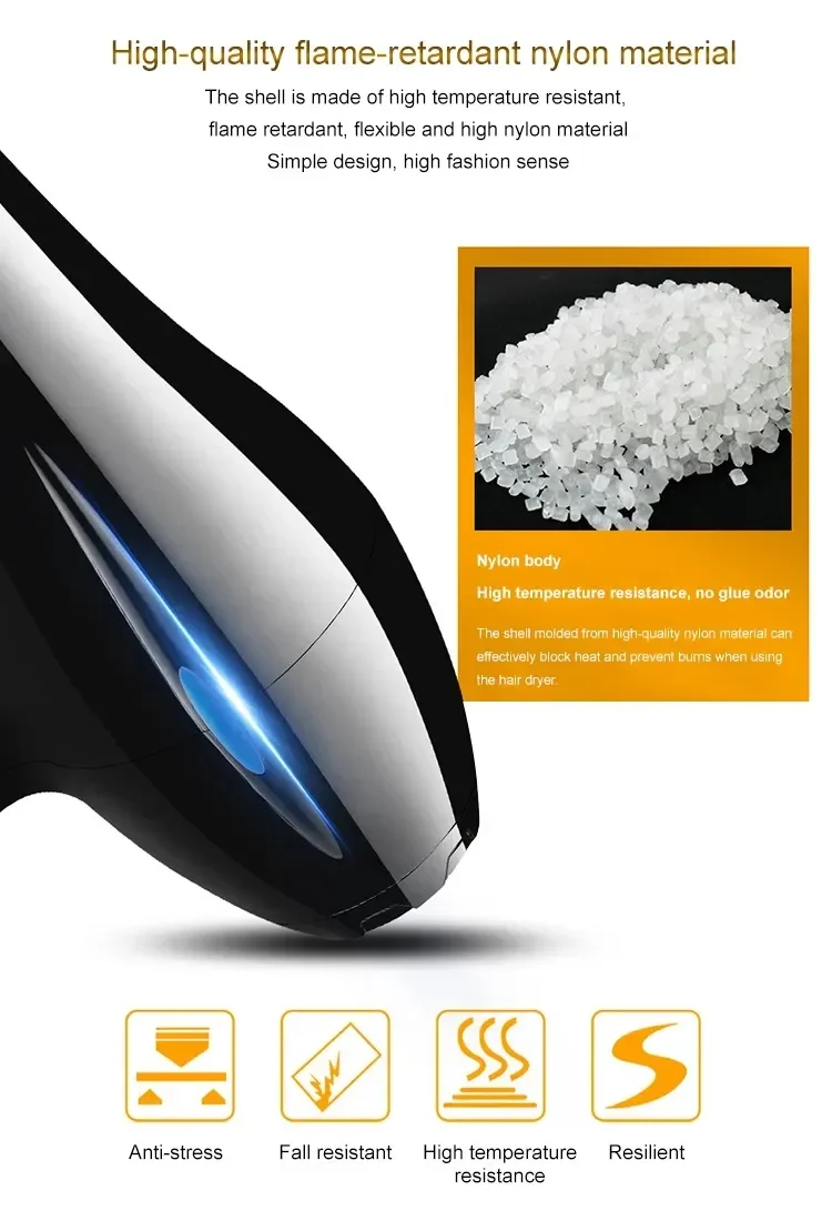 • مقبض محمول وغير قابل للطي:مجفف الشعر هذا مصمم بمقبض محمول وغير قابل للطي ، سهل الحمل ، مما يجعله أداة أساسية للاستخدام المنزلي والسفر.