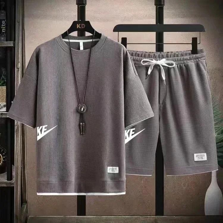 طقم تي شيرت وسراويل كاجوال للرجال ، بدلة رياضية فضفاضة ، بدلة رياضية مطبوعة ، طباعة الوافل ، الصيف ، مقاس 3XL