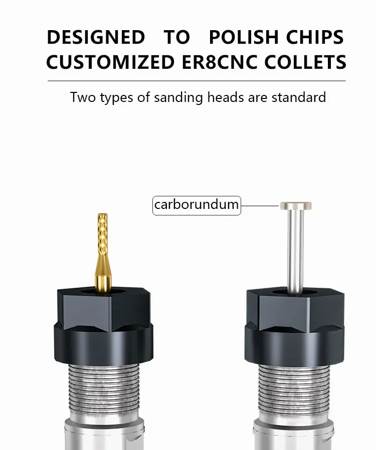 6. مصممة لتلميع الرقائق ، تجمع ER8CNC المخصصة. نوعان من رؤوس الصنفرة هما الكاربوراندوم القياسي.