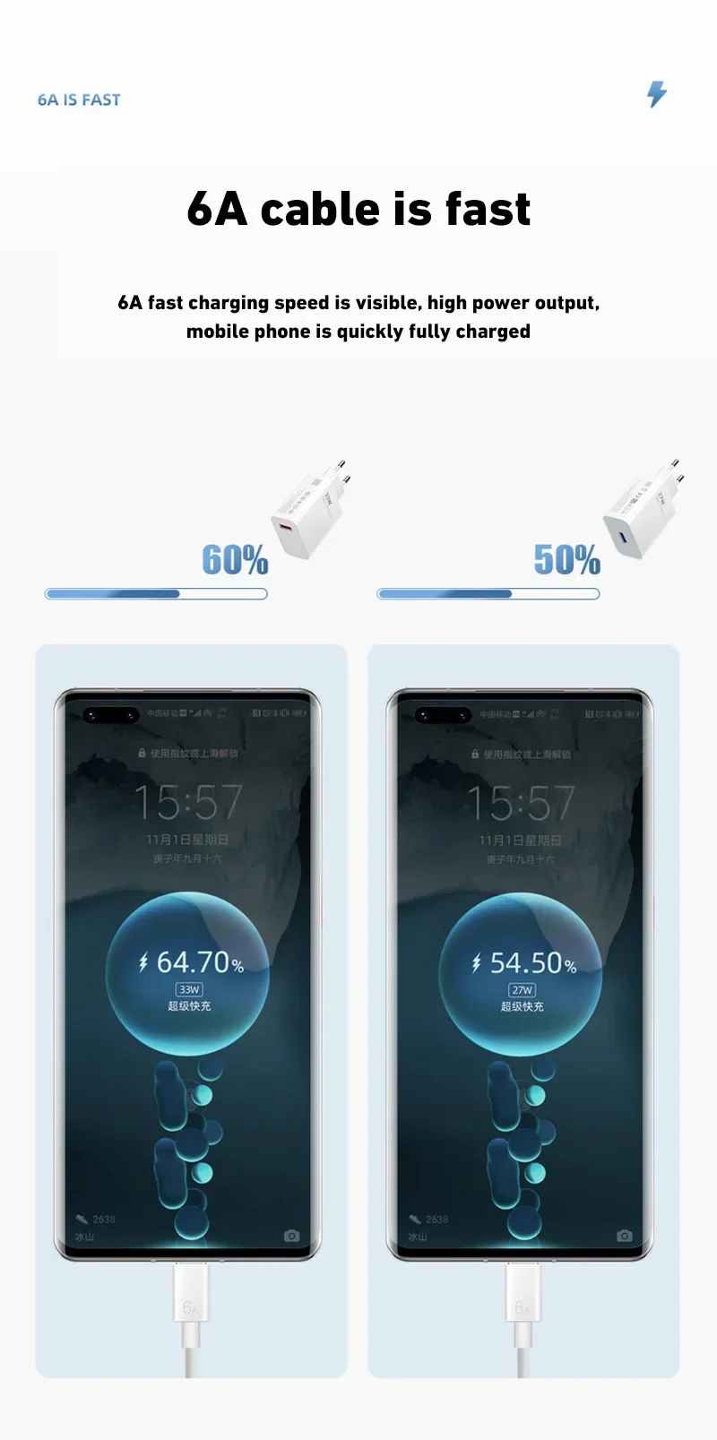 شحن سريع USB محول هاتف محمول سريع ، QC ، شحن سريع ، 6A ، نوع C كابل ، smm ، شاومي ، هواوي