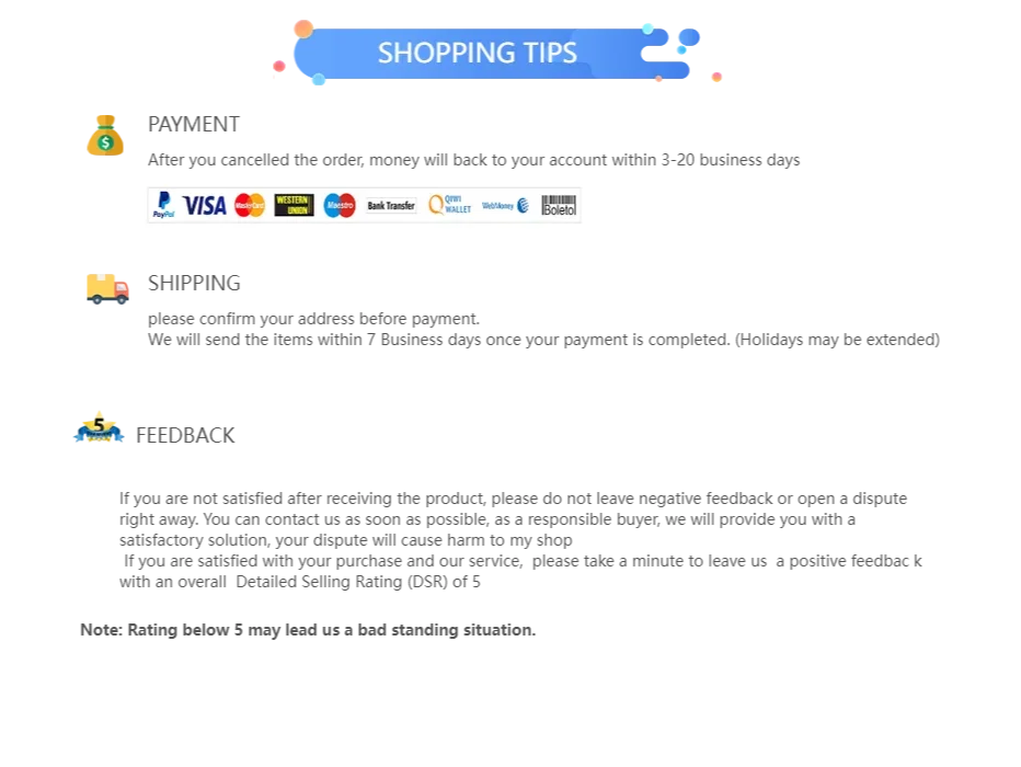 حماية ما بعد البيع إذا كان الطرد الذي تلقيته تالفًا. يرجى عدم ترك تعليقات سلبية ، اتصل بنا في أقرب وقت ممكن. بسبب فارق التوقيت ، سوف نرد على رسالتك في غضون 24 ساعة ونقدم لك حلاً مرضيًا. تقييمك من فئة الخمس نجوم هو أعظم تشجيعنا