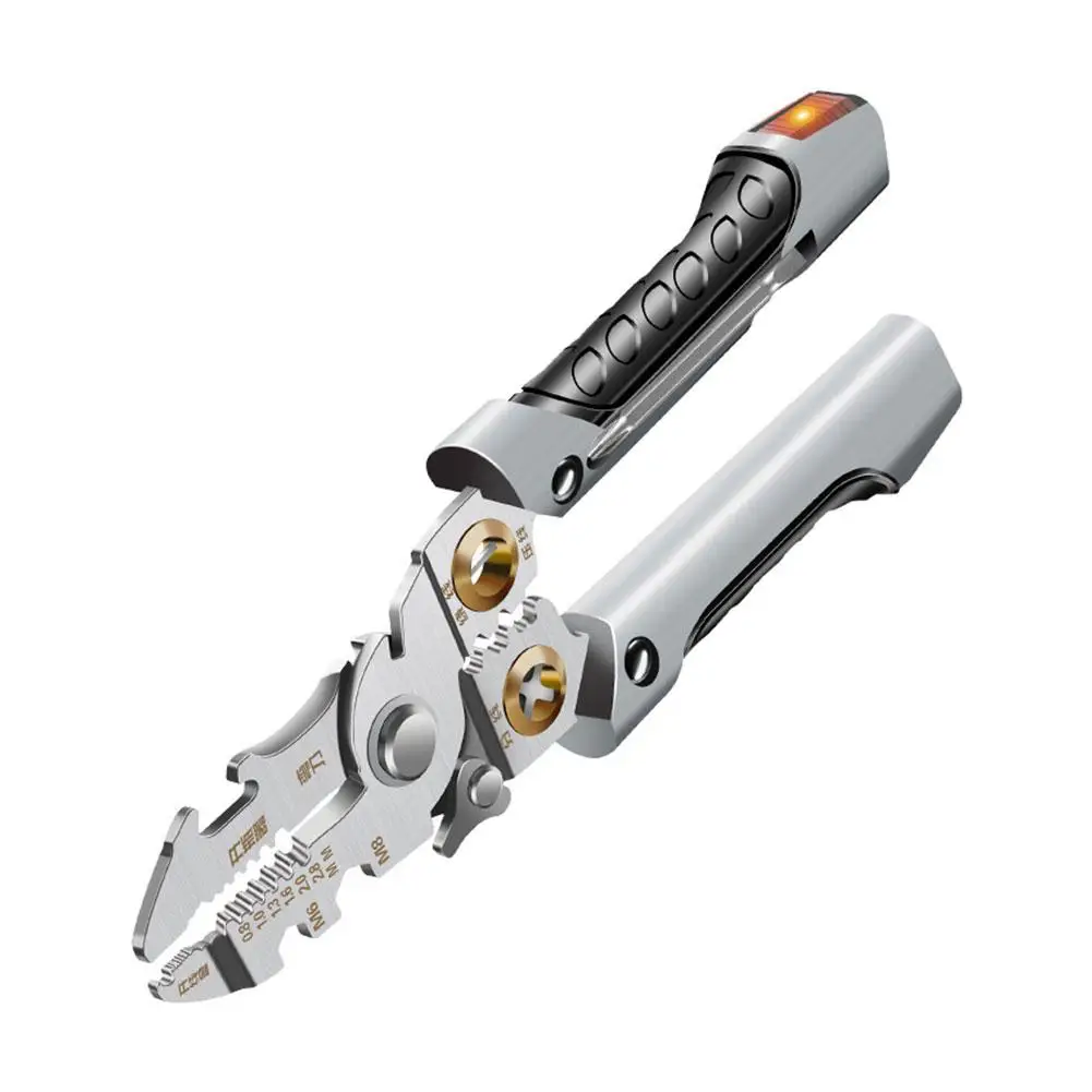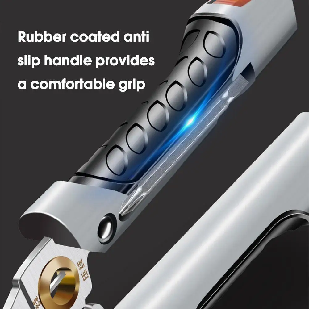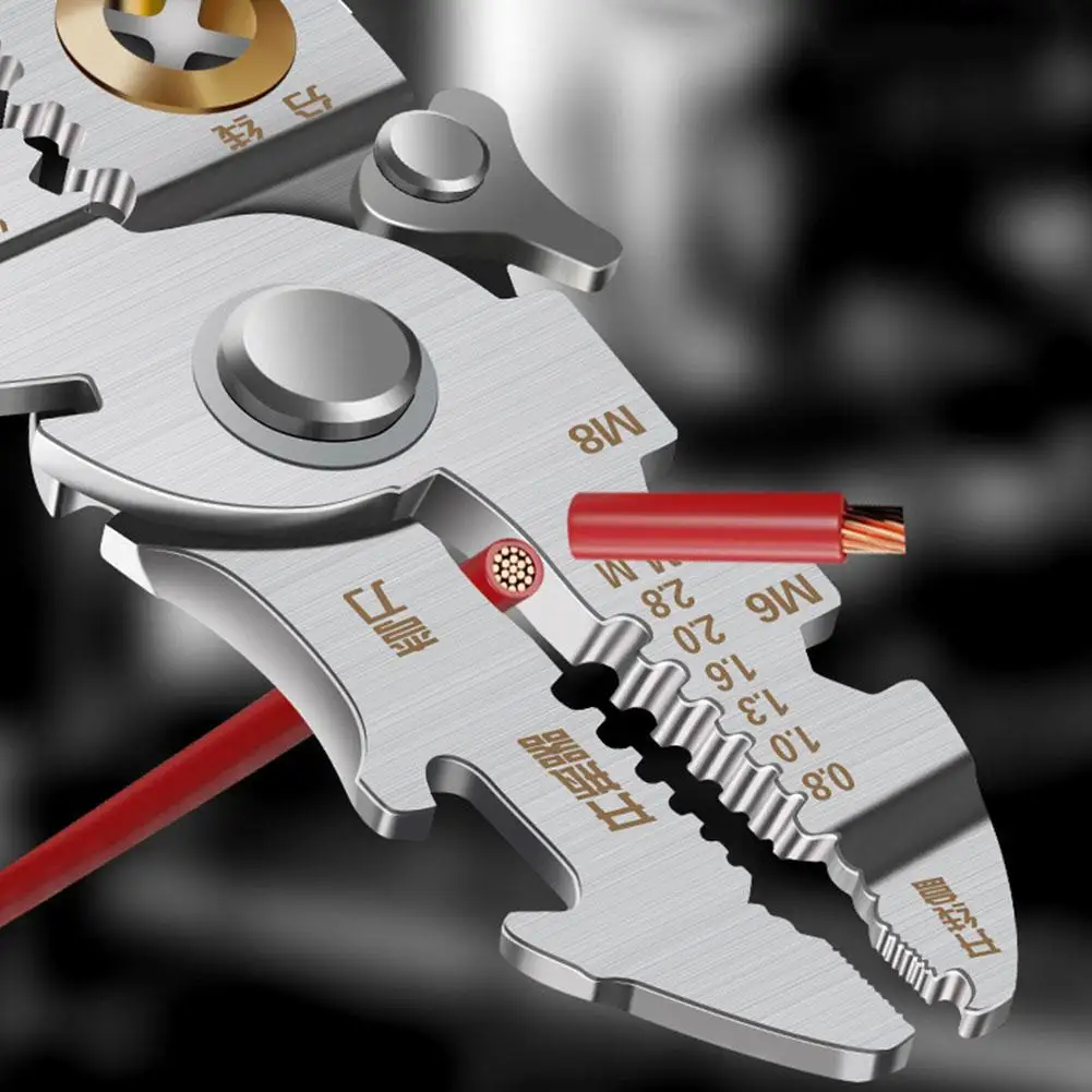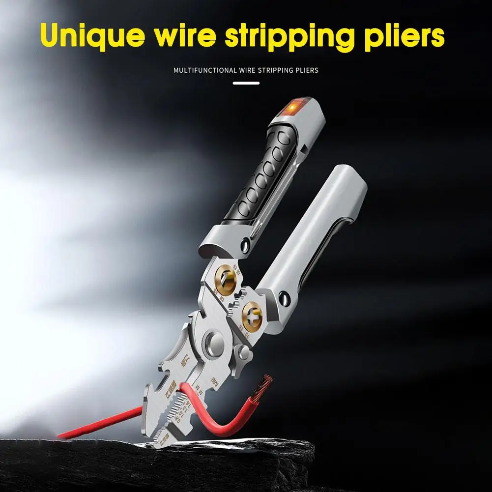 تصميم متعدد الوظائف: هذا متجرد أسلاك الفولاذ المقاوم للصدأ يدمج أدوات متعددة ، بما في ذلك قطع ، تجريد ، كابلات تقطيع ، تقسيم ، لف ، فتح ، سحب الكابلات ، مناسبة لمختلف العمليات الكهربائية. مجهزة بوظيفة قياس الكهرباء ، يمكن استخدام الملء المدمج كقلم خدش لأعمال النجارة