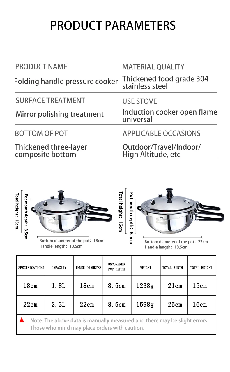 المواصفات: عيار 18 ، المادة: فولاذ مقاوم للصدأ ، ضغط العمل 80KPA سعة 1.8 لتر ، الوزن حوالي g ، موصى به لـ 1-2 شخص ، مناسب للمواقد: مواقد غاز مفتوحة اللهب ، مواقد حثية ، مواقد سيراميك كهربائية ، مواقد هالوجين ، حقيبة تخزين مجانية 1.