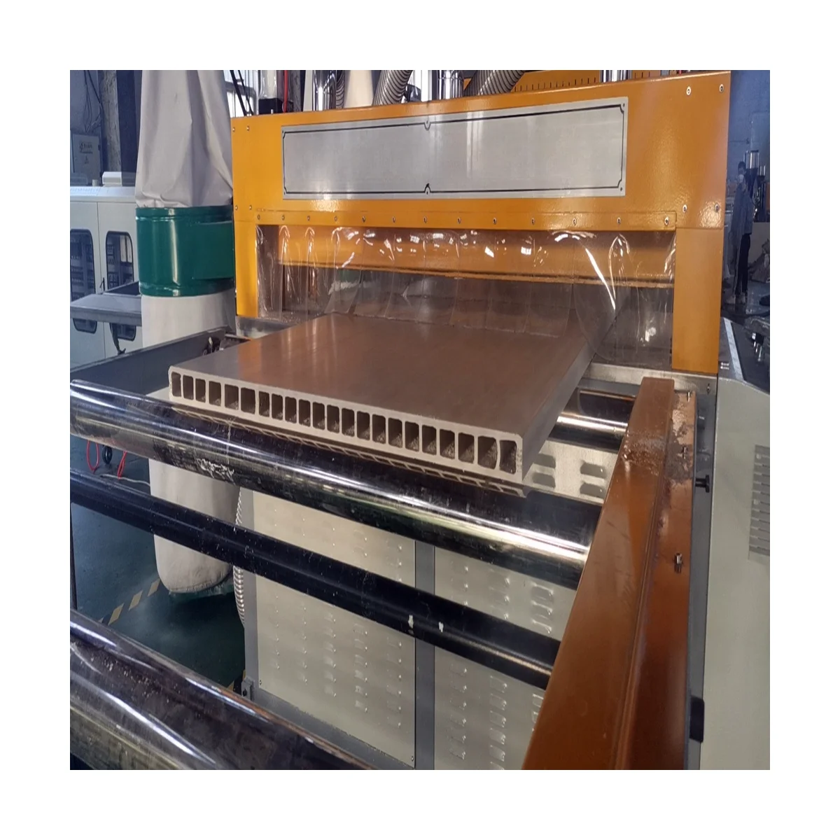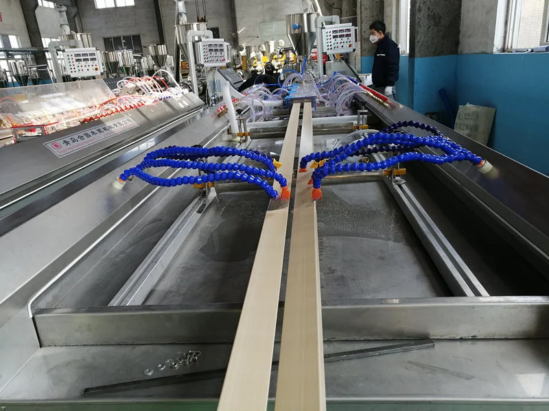 ه. بثق WPC: بثق بواسطة آلة بثق لولبية مزدوجة مخروطية وصب بالحجم والشكل المطلوبين مع معالجة مياه التبريد ، وقطع بطول ثابت عبر الإنترنت.